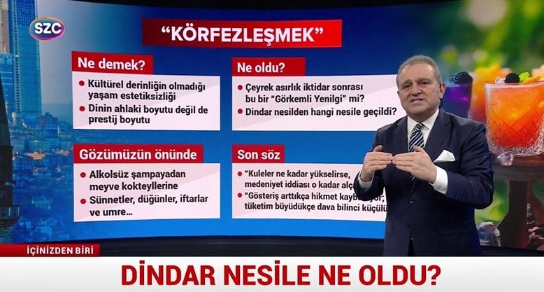 “- Gözümüzün önünde yaşanan gerçeklikler var? Sünnet törenleri, mehter takımları, alkolsüz şampanyalar, nargile kafeler… Baktığınızda bunları topladığımızda şatafatlı bir mağlubiyet diyebiliyor muyuz? Dinin şekli boyutu.”